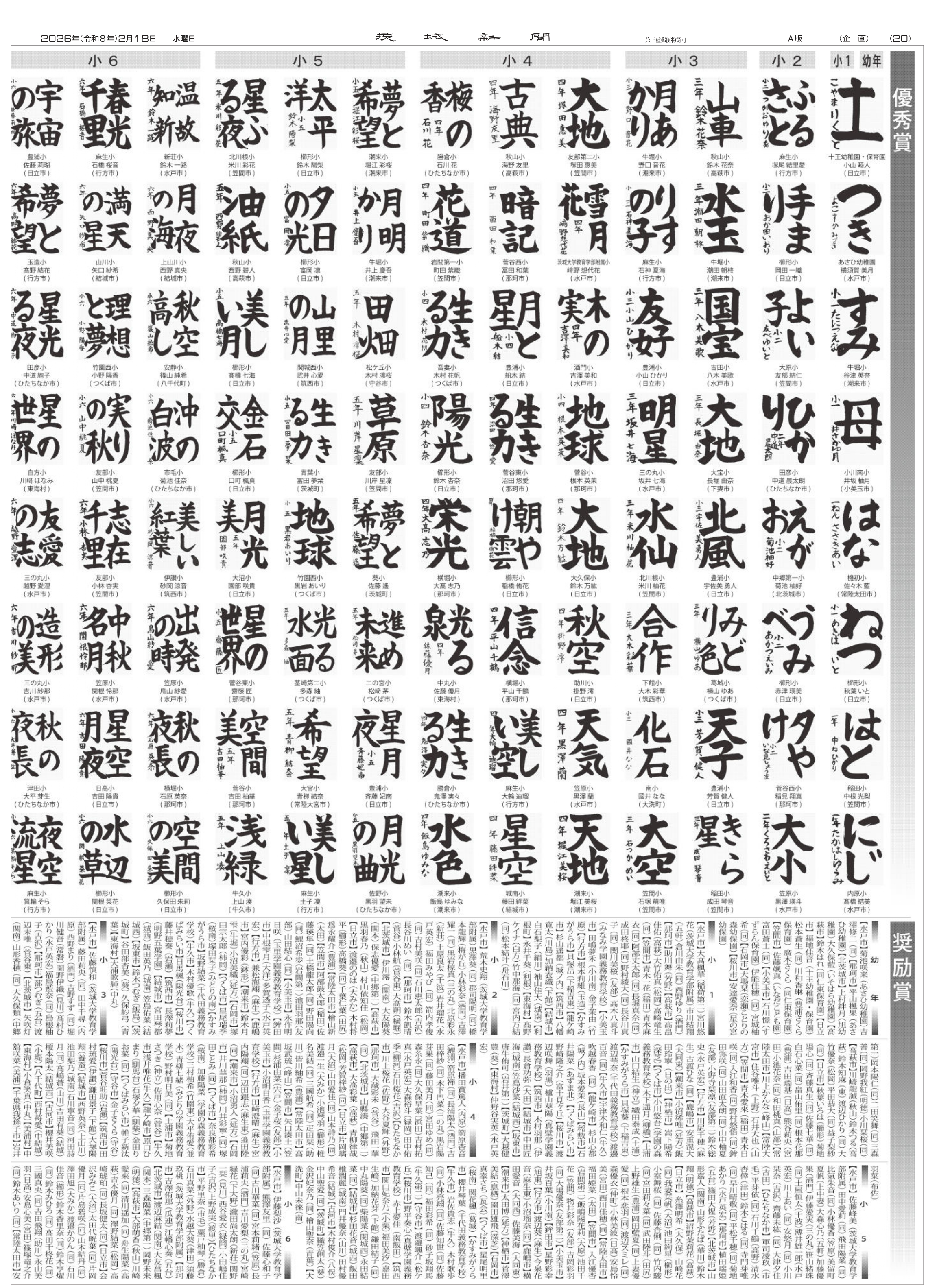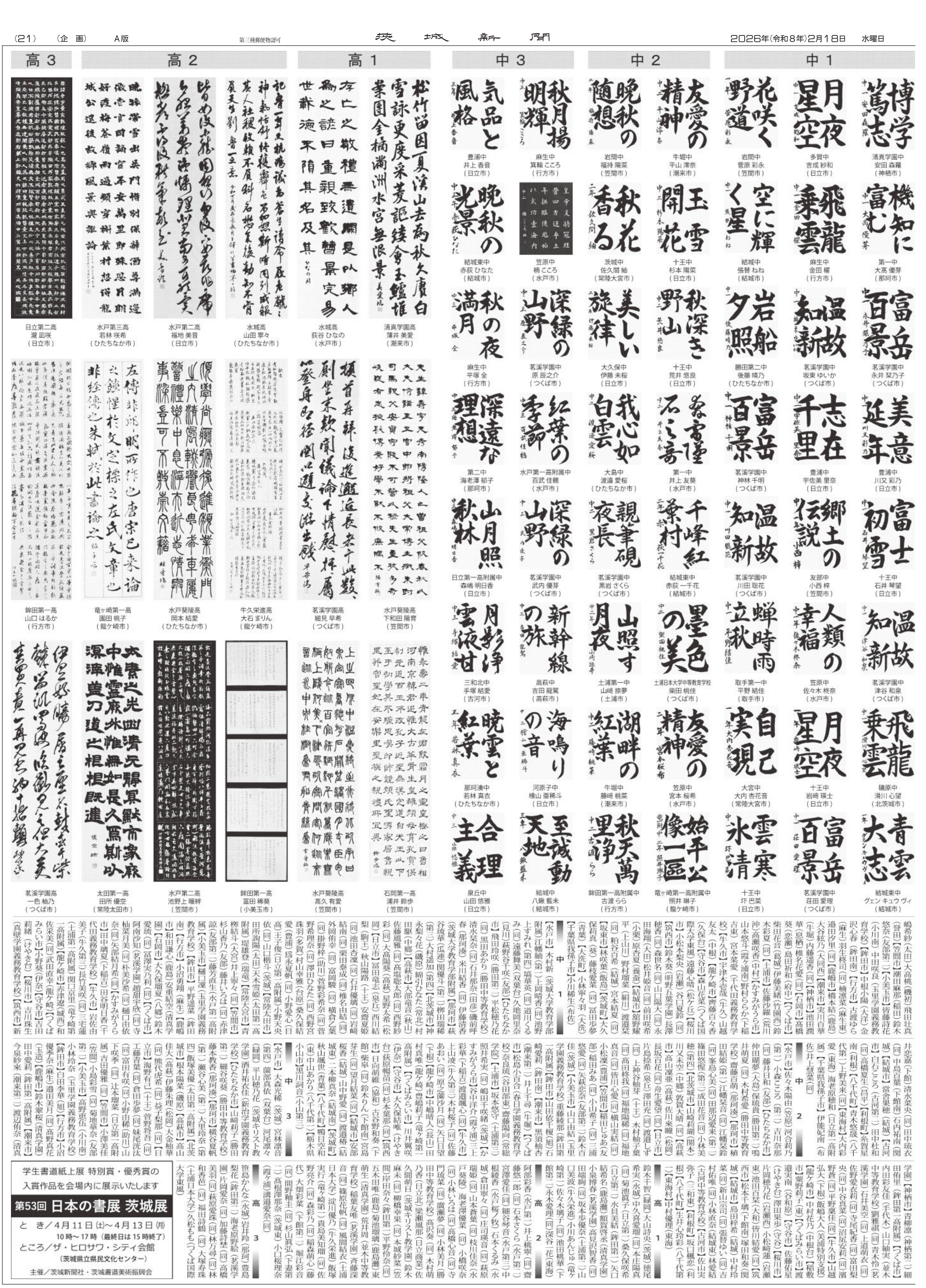 茨城新聞:2026年02月18日掲載県内の児童生徒らの書道作品を公募する「第26回茨城新聞学生書道紙上展」(茨城新聞社、茨城書道美術振興会主催)の入賞作品が決まり、最高賞となる茨城県知事賞には水城高等学校3年の吉尾爽弥さん(日立市)が輝いた。本展は、日本の伝統文化である書道を通して、次世代を担う子どもたちの豊かな心を育て、書道美術の普及と向上を目的に毎年開催している。部門は半紙作品の「幼年・小学生・中学生の部」と条幅作品の「高校生の部」で構成され、2部門の応募総数は9、936点。茨城書道美術振興会の役員が審査に当たり、県知事賞などの特別賞20点、優秀賞178点、奨励賞857点を選出した。特別賞と優秀賞の計198点は4月11~13日まで、水戸市千波町のザ・ヒロサワ・シティ会館で展示される。入場無料。