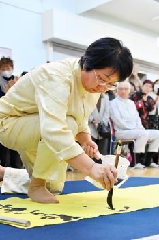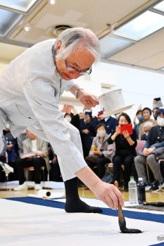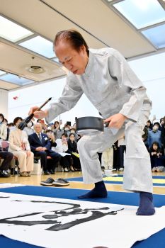 窪山さんは、木簡を参考にしたオリジナルの行書体で「迅飈(じんぷう)」の2文字をしたためた。時が過ぎ去る早さを思い、日々を大切に生きようという願いを込めた。かけ声とともに力強い筆運びを披露し「楽しんで書くことができた」と振り返った。